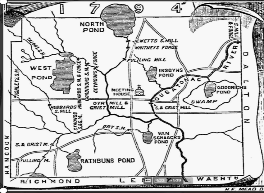 The first factory at the West Pittsfield site on future Cloverdale St. was a sawmill built by Aaron Baker about 1768. In 1770 Baker sold the mill to Valentine Rathbun who converted it to a Fulling Mill for wool brought from local farms. Fulling was a process in which wool was cleaned and thickened before being made into cloth. The Pittsfield map from 1794 shows the Fulling Mill down river from Richmond Pond in the left lower section.